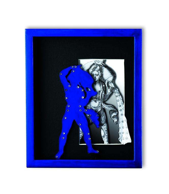 Medidas: 27,5 x 23 x 3 cm. Técnica: estuco y pintura acrílica. Materiales: madera, espejo, papel y cristales.