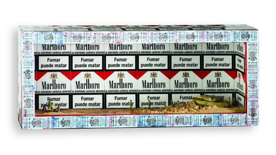 Medidas: 14,7 x 37,2 x 6,3 cm. Técnica: estuco. Materiales: madera, cajetillas de tabaco, polvo de mármol y figuras de plomo.