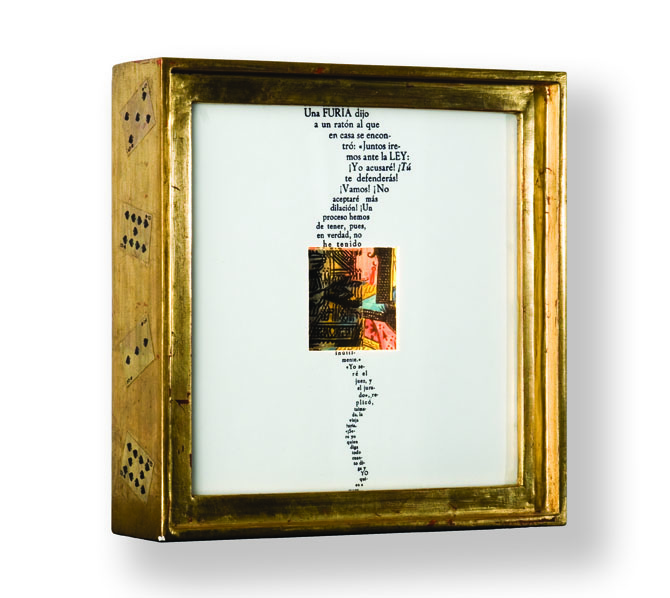 Medidas: 22,5 x 22 x 6 cm. Técnica: estuco y pan de oro. Materiales: madera, espejos, papel y acetato.